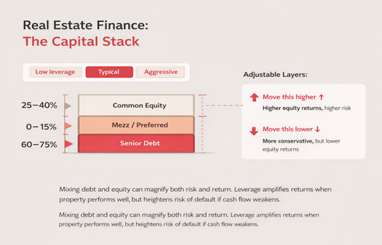 Real estate is usually financed with a mix of debt and equity, often called the capital stack. Debt is borrowed money that must be repaid with interest; equity is the owners’ capital that takes more risk but also shares in the upside.