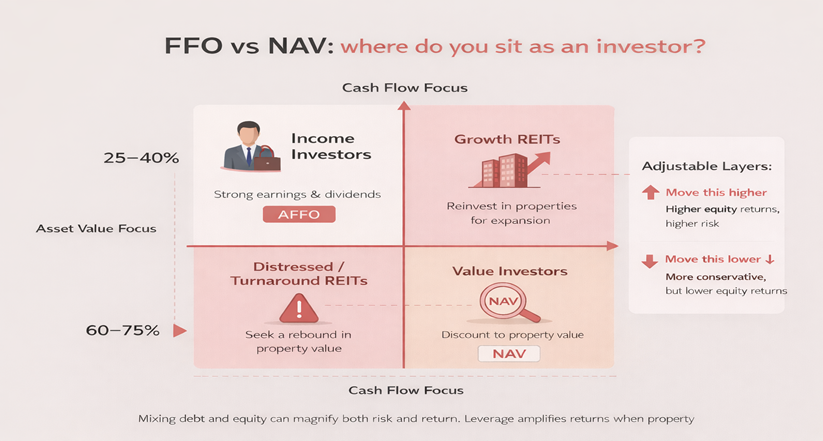 FFO/AFFO to judge earnings and dividends, and NAV to judge asset value and re-rating potential.